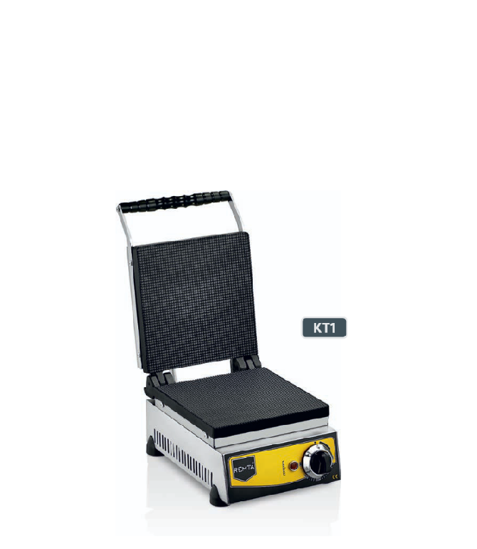 REMTA KT Serisi Elektrikli Kornet Makinesi çelik kasaya ve teflon kaplamalı döküm yüzeye sahiptir. Sanayi tipidir ve otomatik termostatlıdır.
